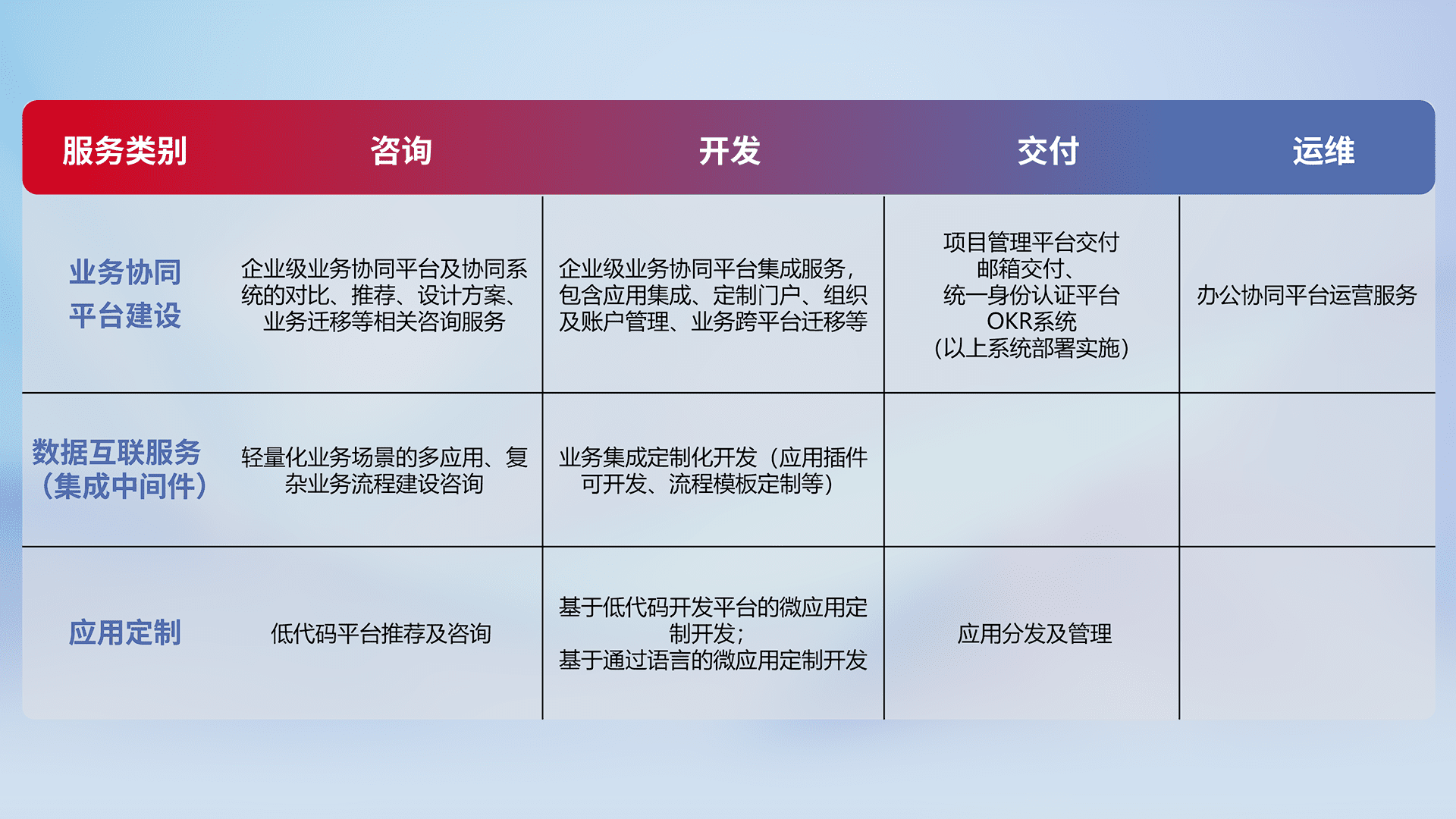 针对钉钉、、、、企微、、、、IDaas等平台级产品提供产品的规划、、、方案、、、交付、、、定制化开发等服务,,实现如统一协同办公、、、智能客户服务、、、混合会议管理、、、、智能数据查询、、、、等业务场景,,,,实现数字化转型。。。